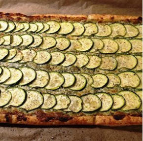 over het bladerdeeg, waarbij je de randen vrijlaat. Snijd de courgette in dunne schijfjes