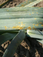 zich door oranje-bruine vlekjes op de bladeren en komt alleen voor op prei en