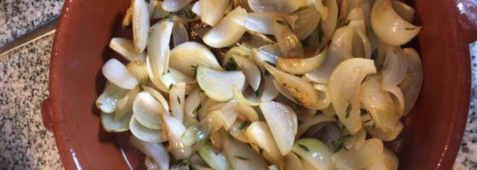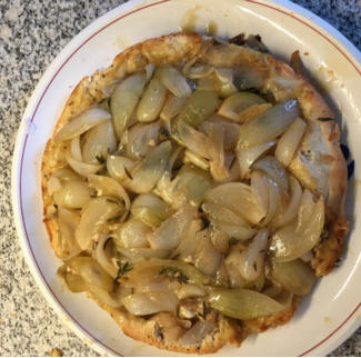 Eten uit je tuin, een uientaartGenoeg uien geoogst afgelopen zomer? Wanneer je dan ook nog tijm en knoflook hebt is de vulling van deze taart helemaal uit je tuin. En geen zompige bodem, deze taart wordt op zijn kop gebakken. Begin met het deeg, meng 250 gram bloem of volkorenmeel met 5 gram zout en 4 gram droge gist. Kneed er met 150 gram melk of water, 2 eetlepels olie en 1 eetlepel mosterd een soepel deegje van. Laat dit afgedekt staan. Maak ongeveer 6-8 uien schoon en snij ze in ringen, of parten. Heb je een zware gietijzeren braadpan dan komt die nu mooi van pas. Smoor je uien in deze pan met wat olie, knoflook en tijm op een laag pitje tot de uien zacht en zoet zijn. Dat duurt zeker een half uur. Er mag ook zout bij. Dan gaan de gesmoorde uien in een ovenschaal, strooi er wat gemalen kaas over en dek de vulling af met het deeg. Het deeg kun je met een rolstok of deegrol uitrollen. Het hoeft niet heel netjes, (maar dat mag wel).De bovenkant bestrooi je ook met kaas en dan bak je de taart ongeveer 40 minuten op 180 graden. Omkeren op een platte schaal, simpel en lekker!Terug naar tuintafel